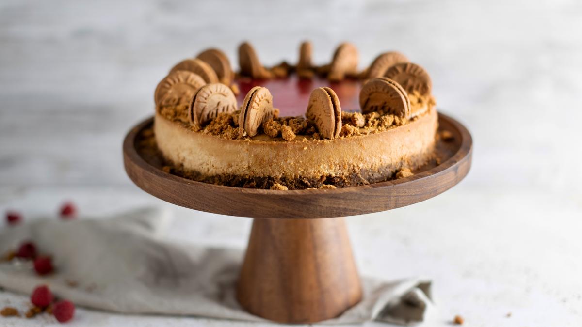 Schmilz die Butter in einer großen Emaille-Schüssel oder einem Topf bei mittlerer Hitze oder in der Mikrowelle. Zerkleinere die Lotuskekse und vermische sie mit der Butter. Fülle die Keksmischung in den Backring und drücke sie mit den Händen, einer Burgerpresse oder einem Glas flach. Backe den Keksboden für 15 Minuten. Nimm ihn aus dem Ofen heraus und lasse ihn abkühlen.